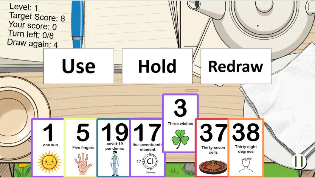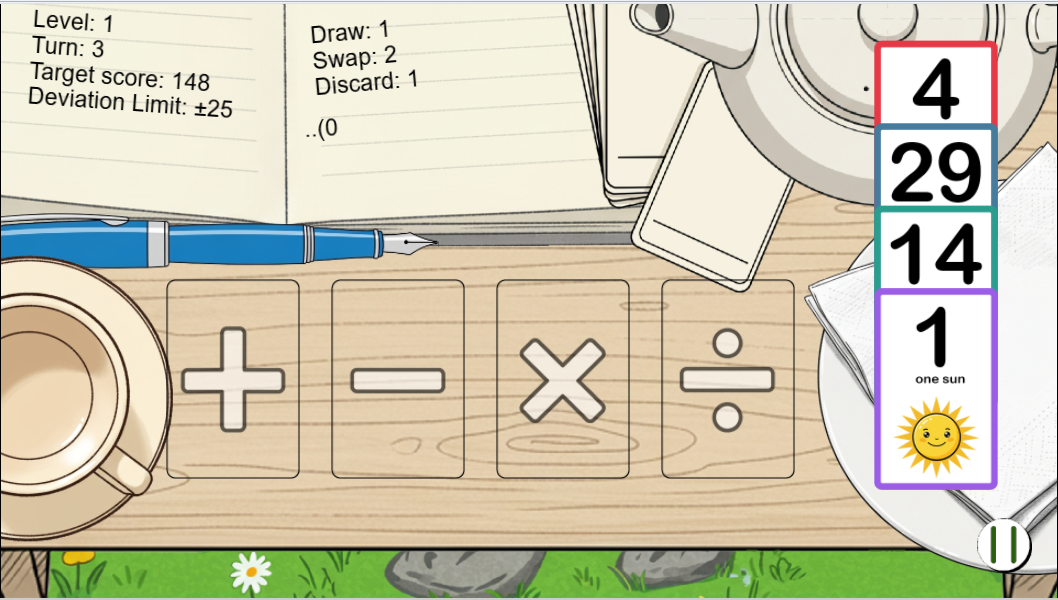 Mở lời ngắn: Một game lấy toán làm luật chơi và kết hợp chút may rủi và một chút hỗ trợ (rút thêm thẻ, hủy thẻ, đổi thẻ) để tạo nên game có chất riêng, rất mong nhận được feedback để tôi có thể cải thiện hoặc sáng tạo thêm.// Quick intro: A game where math sets the rules, mixed with a touch of luck and some handy powers (draw extra cards, cancel cards, swap cards) to create a unique experience. I’d love to get your feedback to improve or add more creativity!