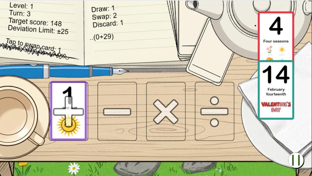 Mục tiêu từng màn (Target Rounds) – Sự chính xác là tất cả. Mỗi màn có số mục tiêu và giới hạn sai số. Kết hợp thẻ và phép tính để tiệm cận mục tiêu. Sử dụng số lần rút, đổi hoặc bỏ thẻ hợp lý. Chạm đúng mục tiêu? Trải nghiệm cảm giác hoàn hảo tuyệt đối!